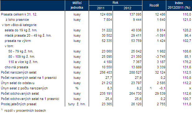 V kraji se zvyšoval stav prasat v roce 2012 rychleji, než činil celostátní průměr. Zatímco v ČR se stavy zvýšily o 3,1 %, v kraji o 10,0 %. Shodně s úhrnem za celou ČR, se snižovaly stavy pouze v kategorii prasat na výkrm o hmotnosti 80 – 109 kg.