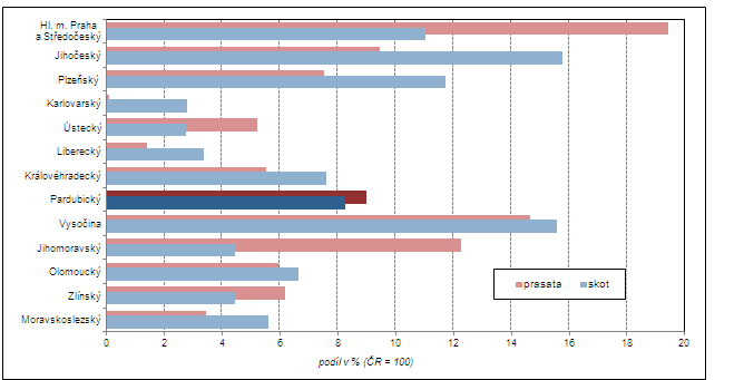 Chov skotu, prasat a drůbeže v Pardubickém kraji v roce 2012