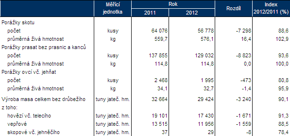 V porovnání s rokem 2011 se v uplynulém roce v kraji snížily počty poraženého skotu, přitom rostla průměrná hmotnost porážených kusů. Odlišné tendence byly zjištěny u porážek prasat; vzrostl počet poražených zvířat při jejich nezměněné průměrné hmotnosti. Počty poražených ovcí se v kraji snížily o pětinu.