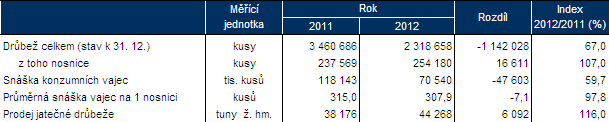 Největší meziroční změny byly v roce 2012 na regionální úrovni zaznamenány ve stavech drůbeže. Celostátně stavy drůbeže vzrostly o 6 %, avšak v Pardubickém kraji se stavy snížily o třetinu (největší pokles mezi kraji) a naproti tomu na dvojnásobek vzrostly stavy drůbeže v Jihočeském kraji.