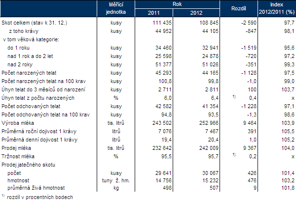 Počet narozených telat na 100 krav se v kraji oproti roku 2011 snížil o jeden kus a krajská hodnota 99,8 narozených telat na 100 krav zůstala nejvyšší mezi všemi kraji ČR.