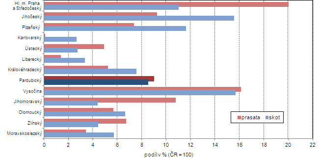 Chov skotu, prasat a drůbeže v Pardubickém kraji v roce 2013