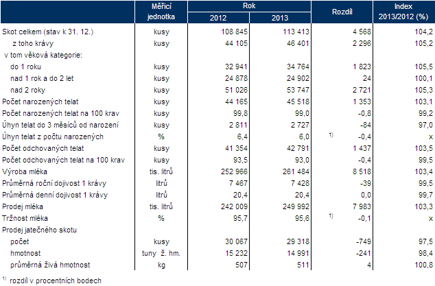 Počet narozených telat na 100 krav se v kraji oproti roku 2012 snížil téměř o jeden kus a krajská hodnota 99,0 narozených telat na 100 krav zůstala nejvyšší mezi všemi kraji ČR.