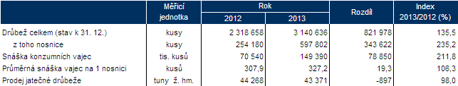Největší meziroční změny byly v roce 2013 na regionální úrovni zaznamenány ve stavech drůbeže. Celostátně stavy drůbeže vzrostly o 2,0 %, avšak v Pardubickém kraji se stavy zvýšily o více než třetinu a ve Zlínském kraji dokonce téměř o dvě třetiny. Naproti tomu o více než dvě třetiny poklesly stavy drůbeže v Kraji Vysočina.