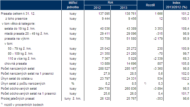 Chov prasat v Pardubickém kraji za roky 2012 a 2013