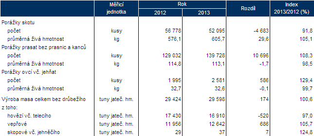 V porovnání s rokem 2012 se v uplynulém roce v kraji snížily počty poraženého skotu, přitom rostla průměrná hmotnost porážených kusů. Odlišné tendence byly zjištěny u porážek prasat; vzrostl počet poražených zvířat při snížení jejich průměrné hmotnosti. Počty poražených ovcí vzrostly v kraji téměř o 30 %.