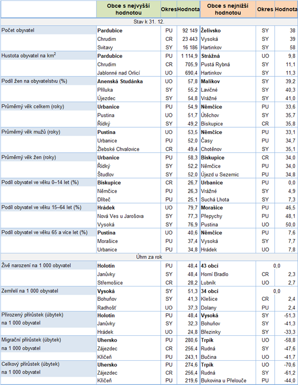 - z hlediska změny počtu obyvatel si nejvíce polepšila města Pardubice (+3,6 tis. obyvatel), Chrudim (+670) a Přelouč (+656), největší úbytek obyvatel zaznamenaly Svitavy (-75 obyvatel) a Lichkov (-20).