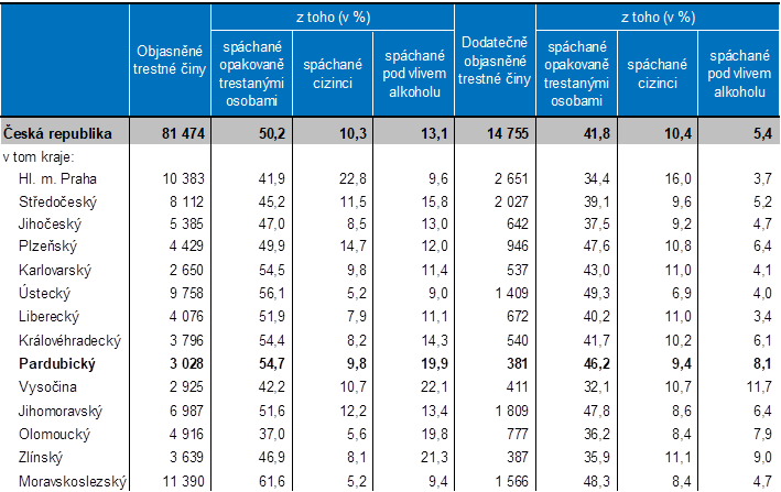 V roce 2022 bylo v Pardubickém kraji zaznamenáno 3 028 objasněných trestných činů (jde o skutky, u kterých je datum zahájení trestního řízení i datum objasnění ve stejném kalendářním roce). Dále v kraji evidujeme také 381 dodatečně objasněných trestných činů, tedy skutků, u kterých je datum zahájení trestního řízení před 1. 1. 2022. Zatímco na objasněných trestných činech v kraji se skutky spáchané pod vlivem alkoholu podílely 19,9 %, na dodatečně objasněných trestných činech pouze 8,1 %. Trestné činy spáchané opakovaně trestanými osobami tvořily přibližně polovinu z objasněných i dodatečně objasněných trestných činů v kraji (54,7 %, respektive 46,2 %), cizinci pak spáchali necelou desetinu z objasněných i dodatečně objasněných trestných činů v kraji (9,8 %, respektive 9,4 %).