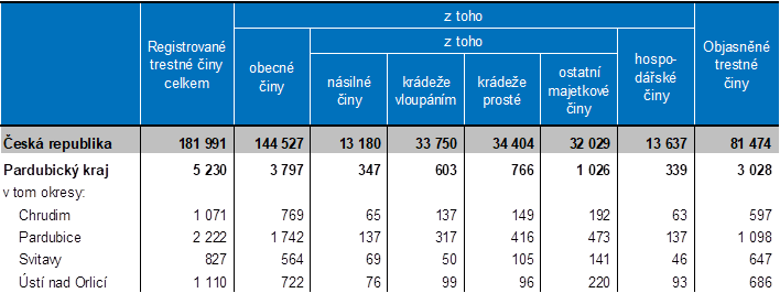 V průběhu roku 2022 bylo v Pardubickém kraji registrováno 5 230 trestných činů, což byl třetí nejnižší počet za dobu existence kraje. Více než dvě pětiny registrovaných trestných činů v kraji spadaly do okresu Pardubice (42,5 %). Při přepočtu na tisíc obyvatel měl Pardubický kraj nejméně registrovaných trestných činů mezi všemi kraji ČR. Z okresů Pardubického kraje vynikalo zejména Svitavsko a Orlickoústecko s druhým, respektive třetím nejnižším počtem registrovaných trestných činů na tisíc obyvatel mezi všemi 77 okresy (vč. Prahy).