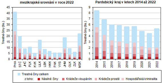V komparaci s předchozími dvěma roky se trestná činnost v Pardubickém kraji v roce 2022 zvýšila, z dlouhodobého pohledu se však počet registrovaných trestných činů v kraji snižuje. Ve srovnání s rokem 2019 se počet registrovaných trestných činů v kraji snížil o 7,2 %, oproti roku 2014 pak o 37,6 %. Také v ostatních krajích ČR evidujeme mezi lety 2014 až 2022 podobný vývoj trestné činnosti. Zatímco k nejméně výraznému poklesu kriminality došlo v Plzeňském kraji (o 14,9 %), nejvýraznější úbytek kriminality mezi roky 2014 až 2022 evidujeme v Hlavním městě Praze (o 43,3 %). V Pardubickém kraji se během tohoto období snížil počet registrovaných trestných činů o 3 150 (tj. o 37,6 %), což znamenalo čtvrtý nejvyšší procentní pokles kriminality mezi kraji (při celorepublikovém poklesu o 37,0 %).