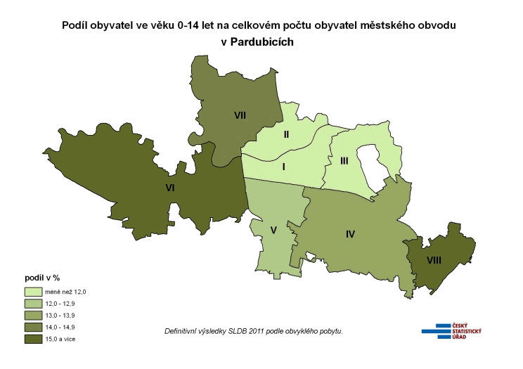 Data SLDB 2011 umožňují rovněž analyzovat věkovou strukturu populace (v dostupných výsledcích zatím podle základních věkových skupin). Nejvyšší podíl dětí ve věku 0-14 let žije v MO Pardubice VI (17 % obyvatel obvodu). Na jeho území probíhá v posledních letech významná výstavba především rodinných domů (Svítkov, Staré Čívice) a jedná se tak o atraktivní oblast pro mladé rodiny.