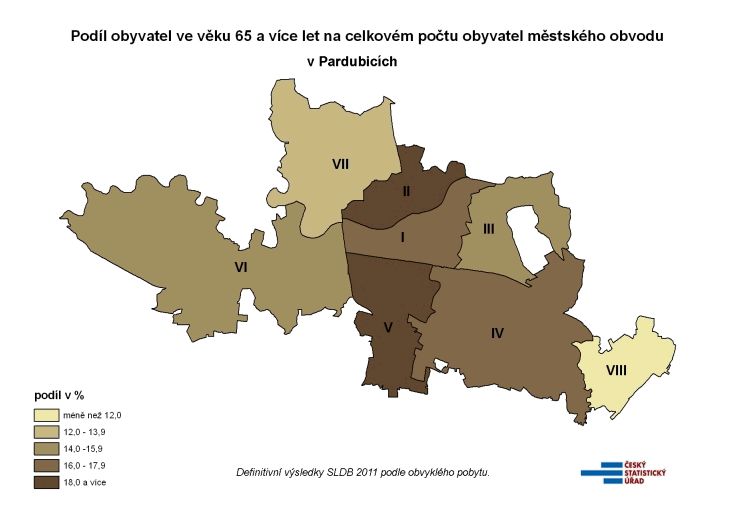 Nejméně příznivá věková skladba obyvatel charakterizuje MO Pardubice II, kde se osoby pětašedesátileté a starší podílejí na celkové populaci obvodu přibližně pětinou a na sto osob do 14 let jich zde připadá přibližně 170, tj. nejvíce ve městě. Převahu počtu osob v nejvyšší věkové kategorii nad počtem dětí ve věku 0-14 let sledujeme rovněž v MO Pardubice V, I, III a IV.