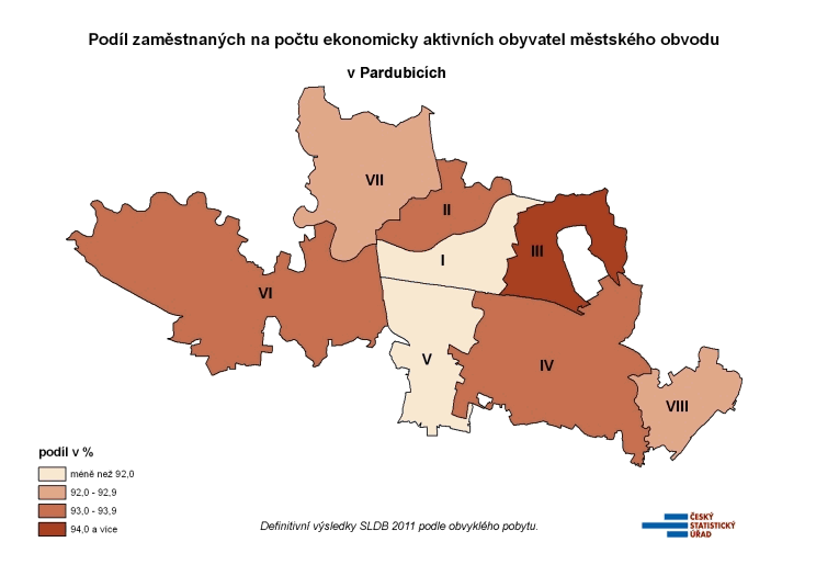 Díky datům ze sčítání lidu lze získat také informace o míře zaměstnanosti, neboli podílu počtu zaměstnaných osob na celkovém počtu osob ekonomicky aktivních (tj. zaměstnaných i nezaměstnaných). Nejvyšší míra zaměstnanosti je typická pro obyvatele MO Pardubice III (94 %), naopak nejnižší zaměstnanost (91 %) charakterizuje obyvatele MO Pardubice V.