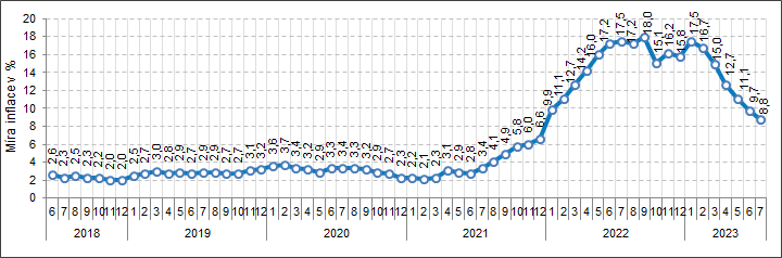 Meziročně vzrostly spotřebitelské ceny v červenci o 8,8 %, což bylo o 0,9 procentního bodu méně než v červnu.