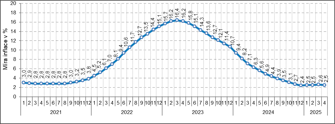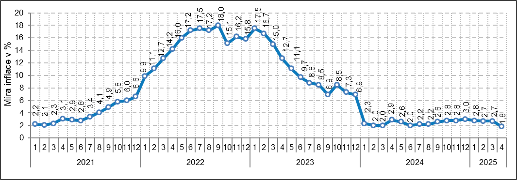 Průměrná roční míra inflace dosáhla v dubnu hodnoty 2,5 %, což bylo o 0,1 procentního bodu méně než v březnu.