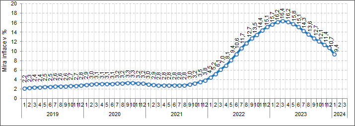 Průměrná roční míra inflace dosáhla v lednu hodnoty 9,4 %, což bylo o 1,3 procentního bodu méně než v prosinci 2023.