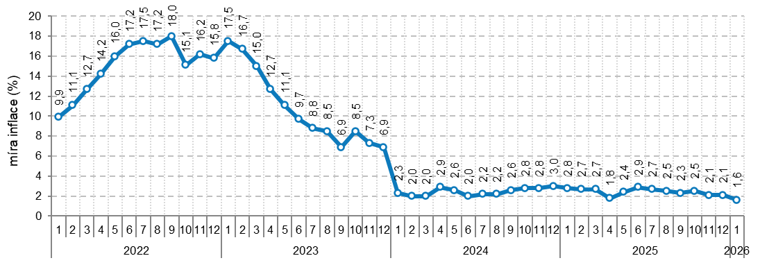 Meziročně vzrostly spotřebitelské ceny v lednu 2026 o 1,6 %, což bylo o 0,5 procentního bodu méně než v prosinci 2025.