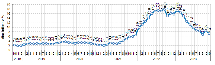 Meziročně vzrostly spotřebitelské ceny v listopadu o 7,3 %, což bylo o 1,2 procentního bodu méně než v říjnu.