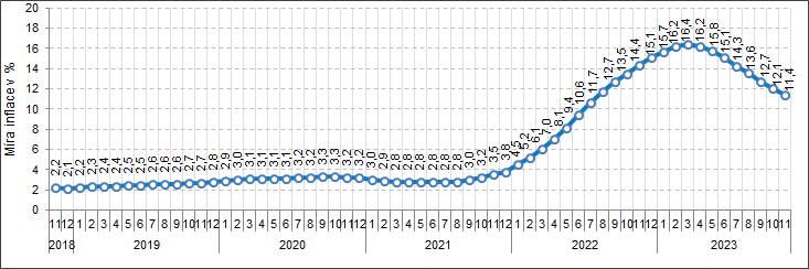 Průměrná roční míra inflace dosáhla v listopadu hodnoty 11,4 %, což bylo o 0,7 procentního bodu méně než v říjnu.