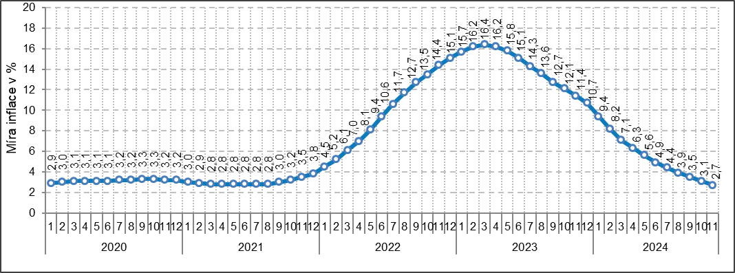 Průměrná roční míra inflace dosáhla v listopadu hodnoty 2,7 %, což bylo o 0,4 procentního bodu méně než v říjnu.