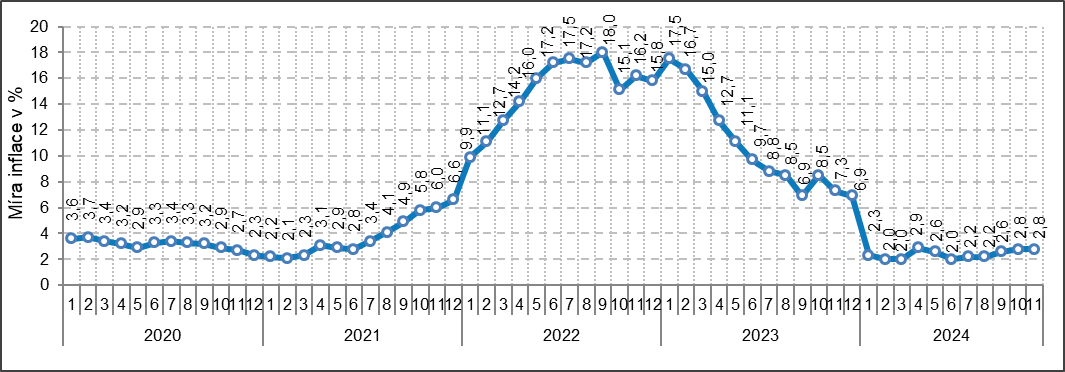 Meziročně vzrostly spotřebitelské ceny v listopadu stejně jako v říjnu o 2,8 %.