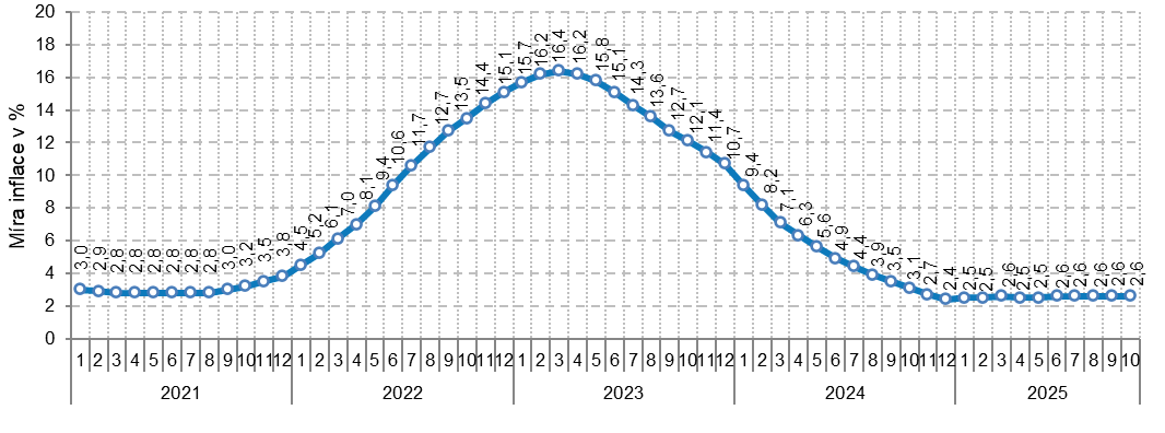 Průměrná roční míra inflace dosáhla v říjnu hodnoty 2,6 % (stejně jako v předchozích čtyřech měsících).