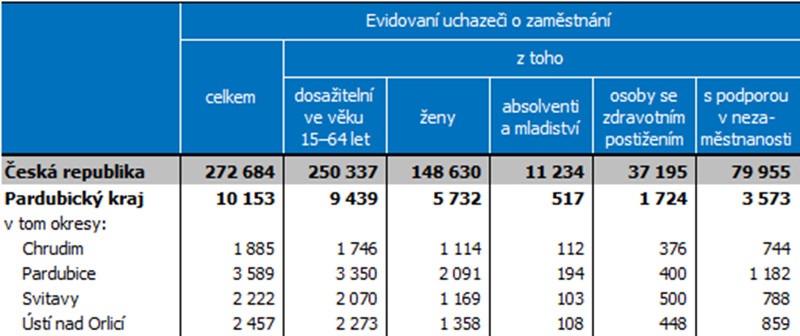 Ke konci prvního pololetí roku 2024 bylo na úřadech práce v Pardubickém kraji evidováno 10 153 nezaměstnaných osob, z toho 17,0 % patřilo mezi osoby se zdravotním postižením a 5,1 % mezi absolventy a mladistvé. Podporu v nezaměstnanosti pobíralo na úřadech práce v kraji 3 573 uchazečů o zaměstnání, přičemž její průměrná měsíční výše dosáhla částky 10 818 Kč (celostátně 11 379 Kč). Většina z uchazečů na úřadech práce v Pardubickém kraji spadala mezi dosažitelné uchazeče (9 439 osob), tj. mezi osoby ve věku 15–64 let, které mohly při nabídce vhodného pracovního místa bezprostředně nastoupit do zaměstnání. Do evidence úřadů práce v kraji se v červnu 2024 nově hlásilo 1 370 osob. Evidence byla naopak ukončena 1 478 osobám, z toho 169 z důvodu neplnění součinnosti s úřady práce. Ve srovnání s předchozím měsícem se tak počet uchazečů o zaměstnání na úřadech práce v kraji snížil o 108, v komparaci se stavem ke konci prvního pololetí roku 2023 vzrostl o 1 181.