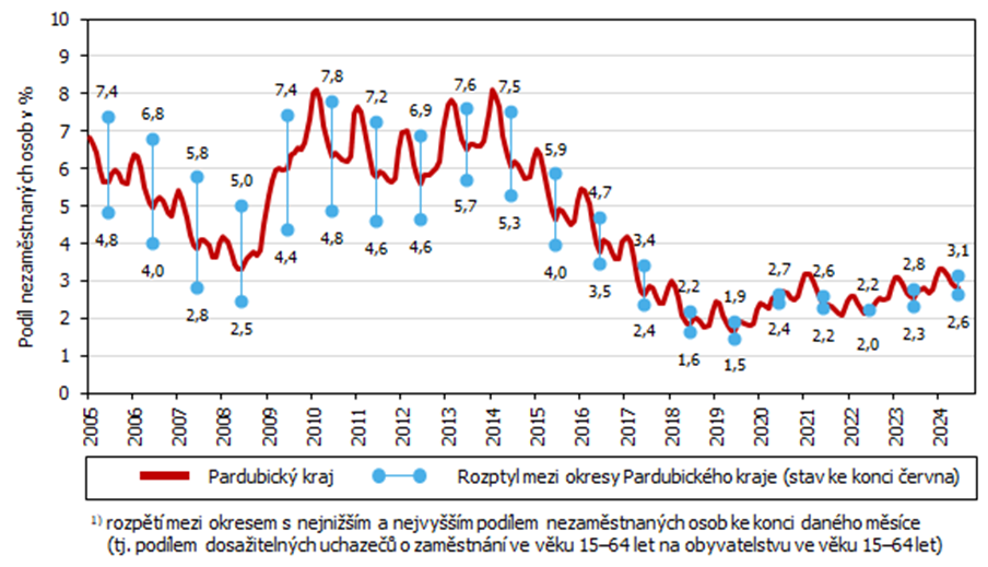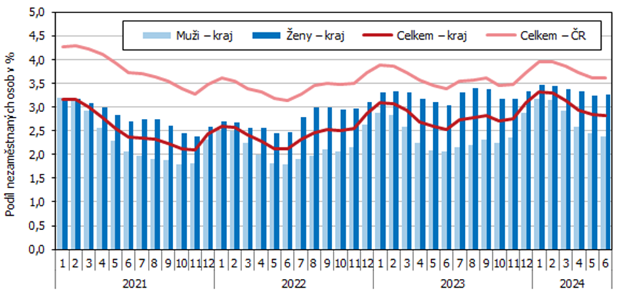 Podíl nezaměstnaných osob (podíl dosažitelných uchazečů o zaměstnání v evidenci úřadu práce ve věku 15–64 let ze všech obyvatel ve stejném věku) dosáhl v Pardubickém kraji ke konci června 2024 hodnoty 2,82 %, což znamenalo nejvyšší červnovou hodnotu v kraji od roku 2017. Zatímco ve srovnání s koncem předchozího měsíce se nezaměstnanost v kraji i celé ČR mírně snížila (v kraji o 0,02 procentního bodu, v celé ČR o 0,01 p. b.), oproti konci června 2023 vzrostla (v kraji o 0,28 p. b., celostátně o 0,21 p. b.). V souladu s celostátním vývojem došlo v kraji k meziměsíčnímu poklesu podílu nezaměstnaných mužů (o 0,06 p. b. na 2,39 %) a naopak růstu podílu nezaměstnaných žen (o 0,03 p. b. na 3,27 %). V komparaci s koncem června 2023 se v kraji oba výše uvedené podíly zvýšily, první jmenovaný o 0,33 procentního bodu a druhý jmenovaný o 0,23 procentního bodu.