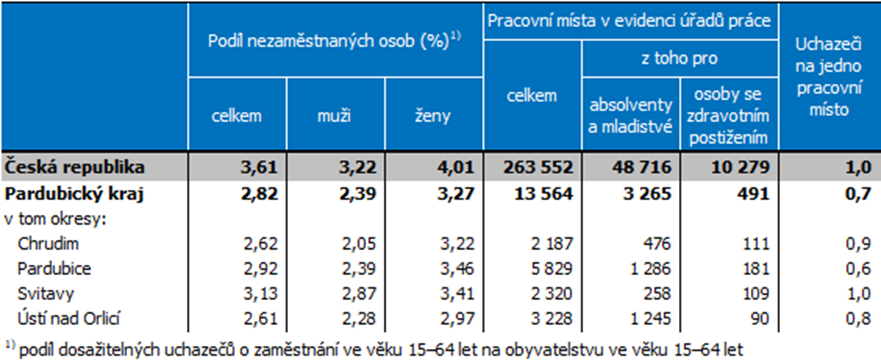 Na jednoho uchazeče o zaměstnání v kraji připadalo na konci června 1,3 volného pracovního místa. Nejpříznivější poměr mezi uchazeči a pracovními místy byl v okrese Pardubice, kde počet volných míst převýšil počet uchazečů 1,6krát. Okres Ústí nad Orlicí měl oproti uchazečům 1,3krát více pracovních míst a okres Chrudim 1,2krát více. Nejméně příznivou situací se prezentoval okres Svitavy, který měl pouze o 98 volných pracovních míst více než uchazečů o zaměstnání.