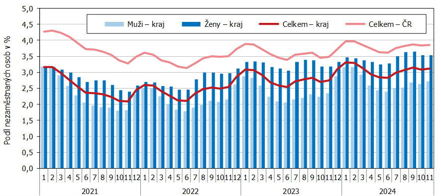 Podíl nezaměstnaných osob (podíl dosažitelných uchazečů o zaměstnání v evidenci úřadu práce ve věku 15–64 let ze všech obyvatel ve stejném věku) dosáhl v Pardubickém kraji ke konci listopadu 2024 hodnoty 3,12 %, což znamenalo nejvyšší listopadovou hodnotu v kraji od roku 2017. Ve srovnání s koncem předchozího měsíce vzrostla nezaměstnanost v Pardubickém kraji o 0,04 procentního bodu a na území celého Česka o 0,02 procentního bodu. Zatímco podíl nezaměstnaných žen se dostal v Pardubickém kraji ke konci listopadu na stejnou úroveň jako v předchozím měsíci (3,54 %), podíl nezaměstnaných mužů se v kraji meziměsíčně zvýšil o 0,07 procentního bodu a ke konci listopadu 2024 dosáhl 2,71 %. Také celostátně vzrostla v průběhu tohoto období pouze nezaměstnanost mužů (o 0,05 procentního bodu na 3,48 %), podíl nezaměstnaných žen v Česku naopak meziměsíčně poklesl o 0,01 procentního bodu na 4,25 %.