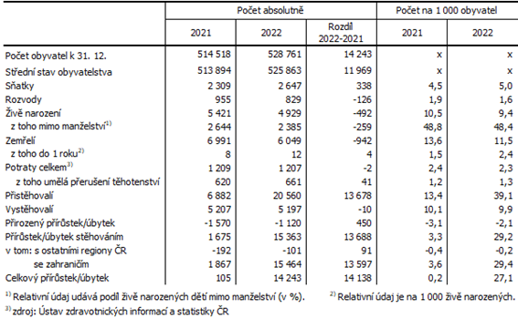 Veškeré údaje se týkají občanů České republiky a cizinců s trvalým pobytem v České republice, občanů třetích zemí s přechodným pobytem na území České republiky na základě dlouhodobého víza (nad 90 dnů) nebo povolení k dlouhodobému pobytu, občanů zemí EU, Norska, Švýcarska, Islandu, Lichtenštejnska a jejich rodinných příslušníků s hlášeným přechodným pobytem na území České republiky a cizinců s platným azylem v České republice. Od roku 2022 jsou do obyvatelstva zahrnovány osoby s udělenou dočasnou ochranou v České republice s obvyklým pobytem v ČR. Údaje zohledňují rovněž události (sňatky, narození a úmrtí) českých občanů s trvalým pobytem na území ČR, které nastaly v cizině a byly zaregistrovány zvláštní matrikou v Brně.