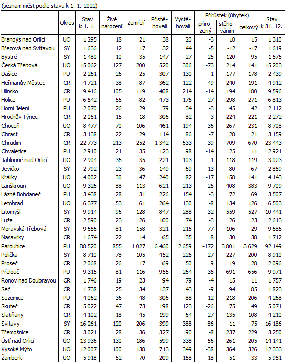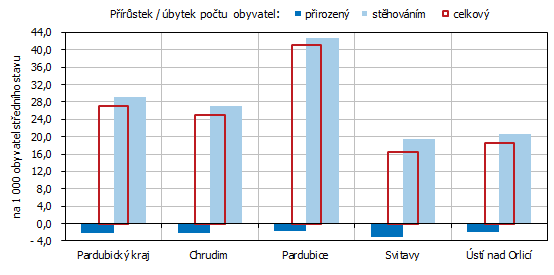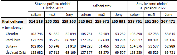 Díky výrazným migračním přírůstkům vzrostly meziročně počty obyvatel ve všech okresech kraje. Nejvyšší celkový přírůstek evidujeme v okrese Pardubice (+7,3 tis. osob), o více než 2,5 tis. narostl v průběhu roku 2022 počet obyvatel okresů Chrudim a Ústí nad Orlicí, na Svitavsku přibylo 1,7 tis. osob. Ve všech okresech kraje byly ve sledovaném období zaznamenány úbytky počtu obyvatel přirozenou měnou (převaha počtu zemřelých nad narozenými), nejvíce na Svitavsku.