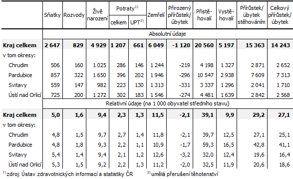 Počet obyvatel Pardubického kraje vzrostl v průběhu roku 2022 o více než 14 tisíc osob, k 31. prosinci 2022 žilo na území kraje téměř 529 tis. obyvatel. Na přírůstku počtu obyvatel se podílelo pouze zahraniční stěhování. Přirozenou měnou kraj obyvatele již třetím rokem výrazně ztratil, když počet zemřelých o 1,1 tis. osob převýšil počet živě narozených dětí. Meziročně ubylo zemřelých, živě narozených dětí i rozvodů, naopak sňatků bylo uzavřeno více.