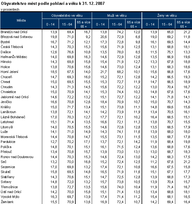 Obyvatelstvo měst podle pohlaví a věku k 31. 12. 2007