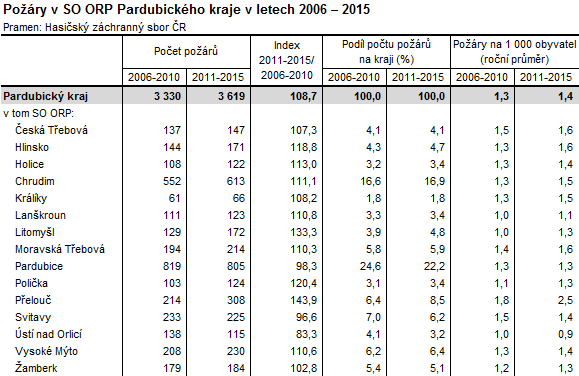 Z níže umístěného kartogramu, který porovnává počet požárů dvou pětiletých období, je patrný největší nárůst počtu požárů v letech 2011 – 2015 proti letům 2006 – 2010 na Přeloučsku a Litomyšlsku. Naopak pokles počtu požárů zaznamenáváme ve sledovaném období na Orlickoústecku, Svitavsku a Pardubicku. I při přepočtu ročních průměrů počtu požárů na 1 000 obyvatel vykazuje nejvyšší přírůstek ve sledovaném období Přeloučsko a nejvyšší úbytek Orlickoústecko.