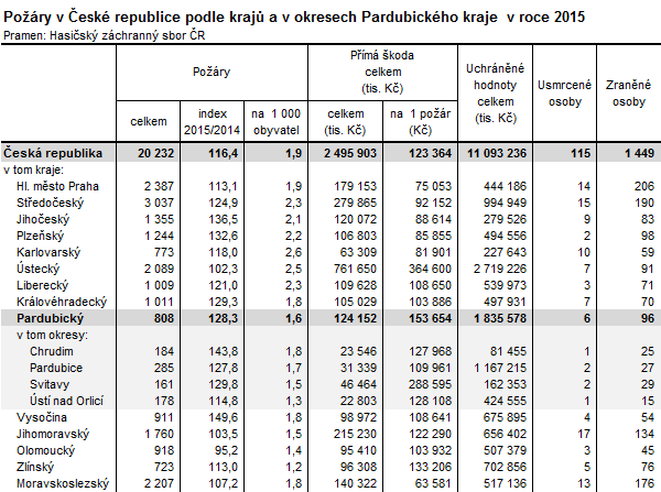 V roce 2015 bylo na území Pardubického kraje likvidováno 808 požárů, při nichž bylo zraněno 96 osob a 6 osob při nich zemřelo. Přímá škoda dosáhla částky 124 mil. Kč, uchráněné hodnoty ve výši 1 836 mil. Kč patnáctinásobně převýšily způsobené přímé škody.