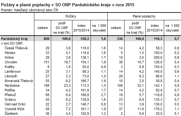 Při bližším pohledu do Pardubického kraje až do správních obvodů obcí s rozšířenou působností (dále SO ORP) vidíme, že nejvíce požárů v roce 2015 náleží SO ORP s největšími městy v kraji, konkrétně se jedná o SO ORP Pardubice (188 požárů) a SO ORP Chrudim (151 požárů), nejméně hořelo na Králicku (8 požárů). V přepočtu požárů na 1 000 obyvatel se v roce 2015 největším podílem požárů umístilo na první příčce Přeloučsko (2,7 ‰) následované Moravskotřebovskem (1,9 ‰), nejmenší hodnota patří Orlickoústecku (0,8 ‰) a Králicku (0,9 ‰).