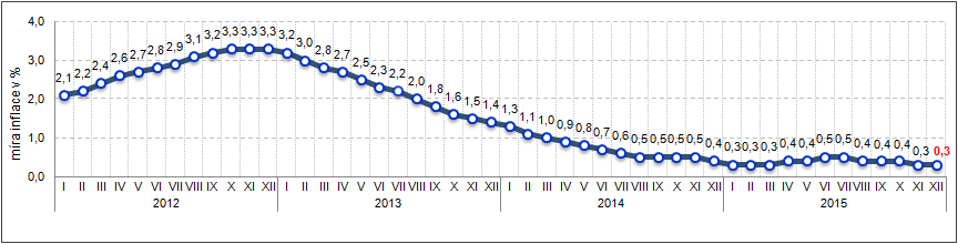 Průměrná roční míra inflace dosáhla v prosinci 2015 hodnoty 0,3 %, což je stejně jako v listopadu 2015.