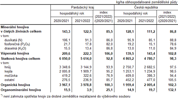 V hospodářském roce 2021/2022 v Pardubickém kraji poklesla spotřeba minerálních hnojiv v čistých živinách i statkových hnojiv v přepočtu na hektar obhospodařované zemědělské půdy (-14,5 % resp. -7,2 %), pokles byl zaznamenán také na celostátní úrovni (-13,2 % resp. - 1,7 %). Spotřeba vápenatých hnojiv proti předchozímu srovnatelnému období vzrostla v kraji i na republikové úrovni (+6,0 % resp. +2,8 %), obdobně se v kraji i v ČR zvýšila hektarová spotřeba organických hnojiv (+0,3 % resp. +2,3 %).