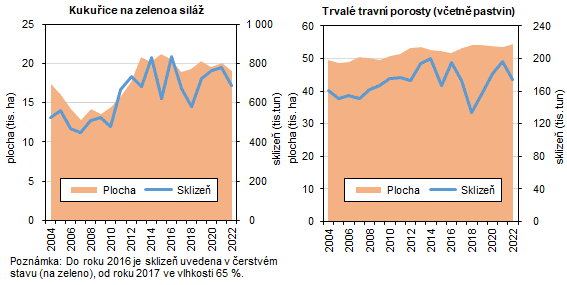 Na pokles sklizně krmných plodin v Pardubickém kraji v roce 2022 mělo vliv snížení hektarového výnosu a u některých plodin i zmenšení sklizňové plochy. Sklizeň kukuřice na zeleno a siláž meziročně v kraji poklesla o 11,7 % na 689,2 tis. tun a představovala 9,1 % republikového úhrnu. Sklizeň píce na orné půdě v kraji meziročně klesla o 11,3 % na 416,9 tis. tun, sklizeň píce v seně z trvalých travních porostů se meziročně snížila o 11,7 % na 173,9 tis. tun. Jetel luční (červený) je v kraji pěstován na třetí nejvyšší rozloze v mezikrajském srovnání (6,7 tis. ha), třetí nejvyšší je i celková krajská produkce jetele lučního (45,8 tis. tun).