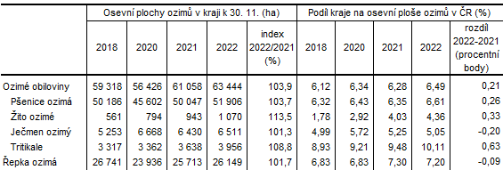 Pšenice ozimá je dlouhodobě nejčastěji pěstovanou plodinou v kraji (56,4 % ze sklizňové plochy obilnin) a v roce 2022 byla sklizena z větší plochy než v roce předchozím. Hektarový výnos se meziročně snížil (6,23 t/ha), celková produkce pšenice ozimé v kraji se však zvýšila téměř o 6 % a dosáhla hodnoty 305,9 tis. tun.