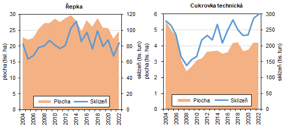 Další významnou zemědělskou plodinou, která byla v roce 2022 pěstována na polích Pardubického kraje, je řepka. Sklizňová plocha řepky v kraji byla proti předchozímu srovnatelnému období rozšířena o 10,3 % na 24,7 tis. ha a byla šestá nejvyšší v mezikrajském srovnání. Hektarový výnos řepky (3,42 t/ha) byl třetí nejvyšší mezi kraji ČR, celková sklizeň se meziročně zvýšila o čtvrtinu na 84,3 tis. tun. Jak vidíme na níže přiloženém grafu, sklizňová plocha řepky v Pardubickém kraji byla v roce 2022 pátá nejnižší od roku 2004, celková produkce řepky byla osmá nejvyšší.