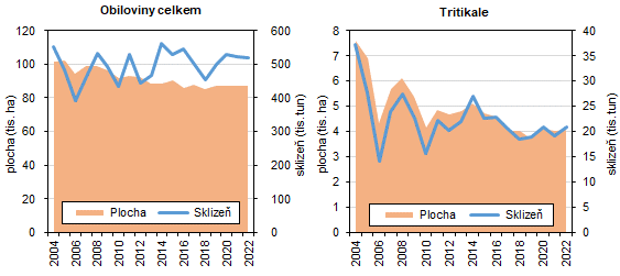 Mezi obilninami na zrno produkovanými zemědělci v Pardubickém kraji dosahuje dlouhodobě nejvyšší podíl na republikovém úhrnu hybridní obilnina tritikale (česky žitovec). Sklizňová plocha tritikale v kraji byla v roce 2022 srovnatelná jako v roce předchozím (4,0 tis. ha), ke zvýšení došlo u hektarového výnosu (nárůst o 0,43 procentních bodů na 5,18 t/ha). Celková sklizeň tritikale se v roce 2022 zvýšila o 9,5 % na 21,0 tis. tun (10,1 % úhrnu ČR) a byla nejvyšší za uplynulých šest let.