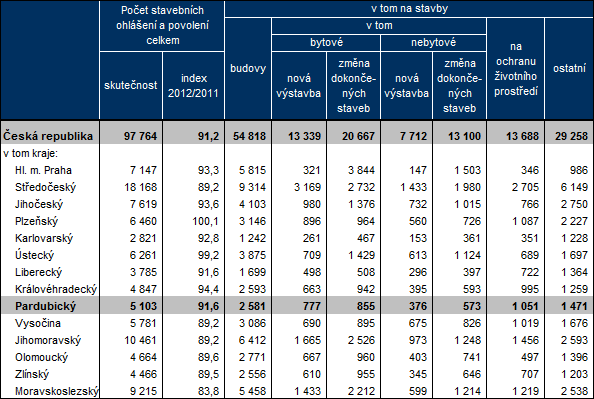 Stavební ohlášení a povolení v Pardubickém kraji a jeho okresech v roce 2012