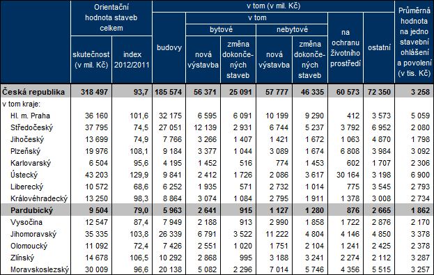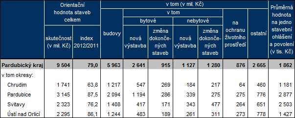 Orientační hodnota staveb v Pardubickém kraji v roce 2012 činila 9 504 mil. Kč (pokles oproti roku 2011 o 2 531 mil. Kč, tj. o 21,0 %) a zařadila kraj na předposlední místo před kraj Karlovarský. Na celkové orientační hodnotě staveb se v kraji v roce 2012 stavby budov podílely 62,7 %. Ve srovnání s rokem 2011 se snížila orientační hodnota staveb budov o 23,0 %, přičemž pokles nastal jak u staveb bytových (o 18,8 %), tak u staveb nebytových (o 28,5 %). Orientační hodnota staveb na ochranu životního prostředí klesla o 57,5 % (tj. o 1 183 mil. Kč) a naopak u ostatních staveb vzrostla o 19,3 % (tj. o 431 mil. Kč).
