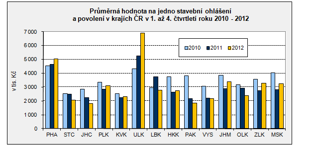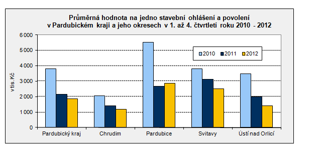 Průměrná hodnota na jedno stavební ohlášení a povolení byla v Pardubickém kraji 1 862 tis. Kč a ve srovnání s rokem 2011 klesla v o 299 tis. Kč (tj. o 13,8 %). K nárůstu průměrné hodnoty na jedno SOP došlo pouze v okrese Pardubice (o 7,8 %). Nejvyšší pokles byl zaznamenán v okrese Ústí nad Orlicí, a to o 28,4 %.