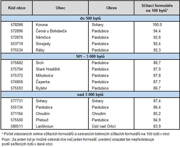 Z údajů o počtu odeslaných elektronických sčítacích formulářů a sebraných listinných sčítacích formulářů na 100 bytů za každou obec vyplývá, jaké je zapojení jednotlivých obcí do sčítání. Mezi malými obcemi jsou nejaktivnější Koruna, Černá u Bohdanče a Němčice. U obcí, ve kterých bylo identifikováno více než 500 bytů, jsou na prvních pozicích Srch, Staré Hradiště a Mikulovice. V kategorii, kterou představují obce s více než 3 000 byty, vynikají ve sčítání Svitavy, Pardubice a Chrudim.