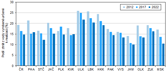 Podíl ztrát z vody vyrobené určené k realizaci se snížil v kraji od roku 2012 o 2,8 procentního bodu na 14,5 % v roce 2022 a tento podíl byl v mezikrajském srovnání 6. nejnižší. Jak naznačuje níže umístěný graf, nejnižší podíl ztrát z vody vyrobené určené k realizaci dlouhodobě vykazuje Jihomoravský kraj (10,0 % v roce 2022), naopak nejvyšší podíl je evidován v Ústeckém kraji (21,7 % v roce 2022). Na republikové úrovni se snížil podíl ztrát z vody vyrobené určené k realizaci od roku 2012 o 4,6 procentního bodu.