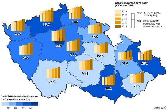 Nejvyšší specifické množství vody fakturované celkem i vody fakturované domácnostem bylo v rámci krajů České republiky v roce 2022 vykázáno v Hlavním městě Praze (162,8 l/osobu/den, resp. 111,2 l/osobu/den) a nejnižší ve Zlínském kraji (111,3 l/osobu/den, resp. 77,2 l/osobu/den). V Pardubickém kraji bylo v roce 2022 vyfakturováno v přepočtu na osobu a den celkem 119,6 litru vody, domácnostem bylo fakturováno 78,8 litru na osobu a den; což představuje čtvrté, resp. druhé nejnižší množství vody v mezikrajském srovnání.