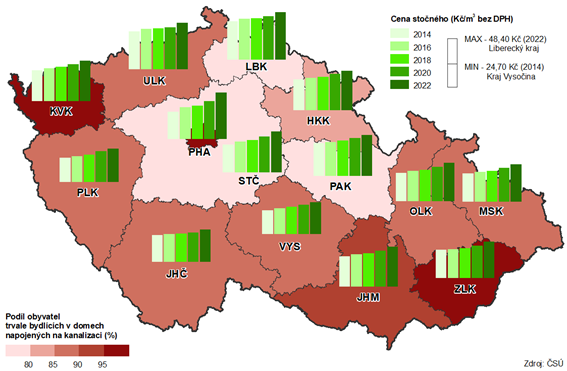 Cena služeb spojených s odváděním a čištěním odpadních vod (stočné) byla v kraji v roce 2022 evidována v průměrné výši 42,20 Kč/m3 bez DPH. U ceny stočného, obdobně jako u ceny vody (vodného), bylo v kraji evidováno meziroční zvýšení (+2,20 Kč), porovnáním cen stočného s rokem 2017 odběratelé zaplatili o 7,10 Kč více. Na rozdíl od vodného, které bylo v roce 2022 v mezikrajském srovnání třetí nejnižší, stočné bylo ve stejném období čtvrté nejvyšší a o 1,20 Kč překonalo průměr ČR. Nejvyšší cenu za stočné zaplatili obyvatelé Libereckého kraje (48,40 Kč/m3), nejméně naopak obyvatelé Kraje Vysočina (32,60 Kč/m3).